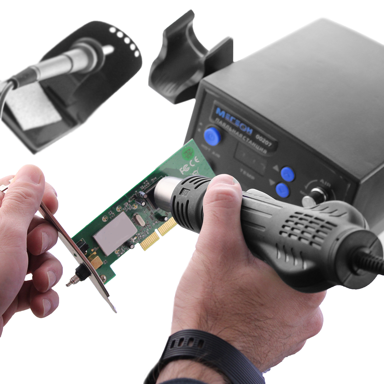МЕГЕОН 00207 — это комбинированная паяльная станция, имеющая термофен и паяльник с цифровым управлением и индикацией. Нагнетатель, встроенный в рукоятку фена, уменьшает вес и исключает лишние шумы и вибрацию. Система интеллектуального охлаждения нагревателя термофена значительно увеличивает срок его службы. Все компоненты имеют эргономичную форму и защитные приспособления. Приобретение запасных и новых жал облегчает распространённость типоразмера 900М. За счёт самого широкого ассортимента наконечников в этой серии расширяется перечень выполняемых работ. Микропроцессор поддерживает температуру с высокой точностью, снижая вероятность перегрева радиокомпонентов в процессе технологической операции, а функция защиты от статического электричества в полной мере исключит поражение радиоэлектронной аппаратуры.
